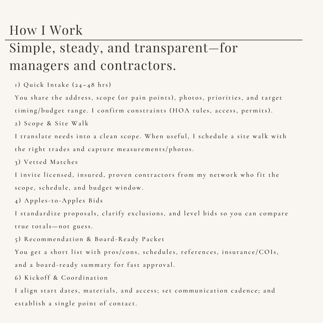 I created BlueThread Connect to solve the biggest pain in property projects: coordination. In Dallas & Austin, I match HOAs, multifamily investors, and commercial owners with vetted, insured contractors and manage the process—scope, bid leveling, schedules, and board-ready updates—so you make one call, not ten. Clear scopes. Trusted teams. Steady communication. That’s how we get capital work done right, from first walkthrough to final punch list.